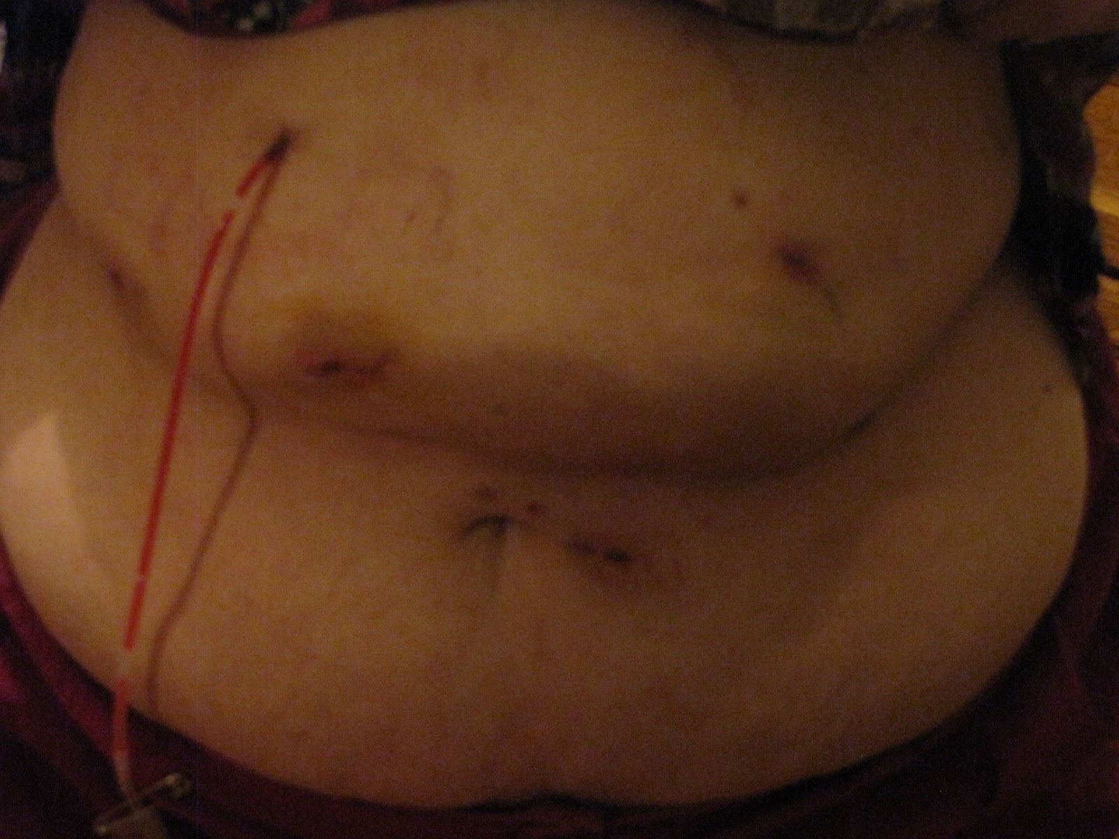 Good news #3 from the visit - I got the drainage tube out. Now...a word of warning...the picture I am going to post is "strong" as Mike says. It's not explicit, it's not vulgar - it's my stomach today. It shows the 6 incisions and the tube coming out of one.